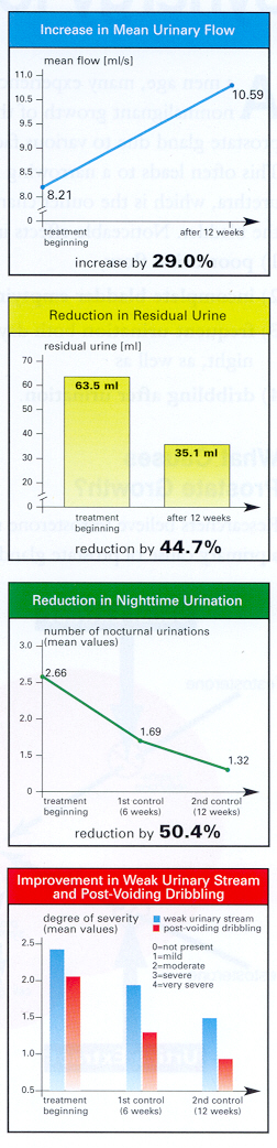 Sabal and Urtica Extracts: Synergistic Effectiveness Developed by the Dr. Wilmar Schwabe Company (parent company to Nature's Way), ProStolTm delivers the actual, Sabal and Urtica formula used in clinical studies. And, it's the only prostate formula medically proven to be a 'dual enzyme inhibitor'. In fact, the Prostol formula has been shown to be more effective than taking saw palmetto alone. ProStolTm is an all-natural dietary supplement administered in a convenient two-a-day dose. It's completely safe, with no reported drug interactions or contraindications. And unlike synthetic prostate health products, ProStolTm has not been shown to interfere with normal sexual performance. The charts to the right highlight some of the conclusive results of taking clinically proven ProStolTm from Nature's Way. Study Citation: Schneider H.J. et. al., Fortschritte der Medizin, Nr. 3, pp. 37-40,