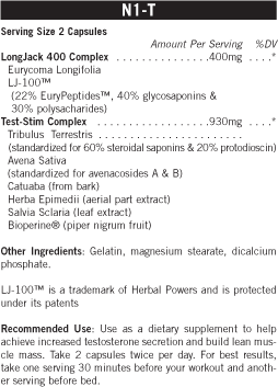 N1-T is the most potent pro testosterone formula available that will help raise your free testosterone ratio. It combines three of the most scientifically proven boosters, tribulus, longjack and avena sativa.